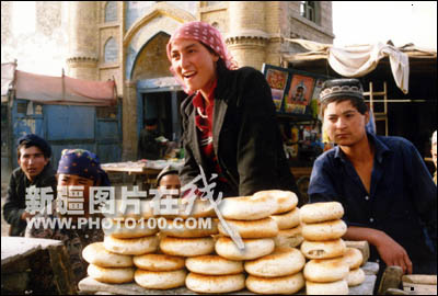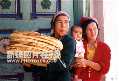 “馕”是维吾尔等民族日常生活的主食。以面粉发酵后在馕坑里烘烤而成,可以存放的时间很长,种类很多,大小不一。最大的馕直径有50厘米,周边厚,中间薄,戳有花纹,放少量盐和洋葱。最小的馕只有普通口杯大,最厚的馕有6厘米左右。此外还有肉馕、油馕、甜馕,又脆又香。