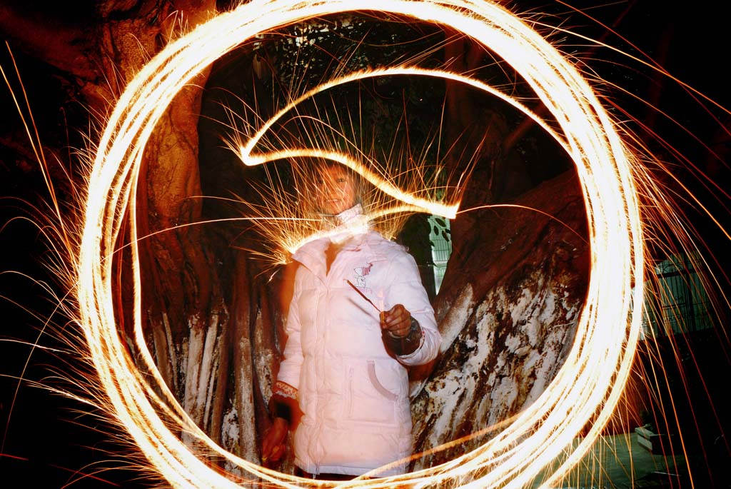 利用长时间固定曝光再加上明亮的烟火~ 光祭~ 呵呵~~很是漂亮!