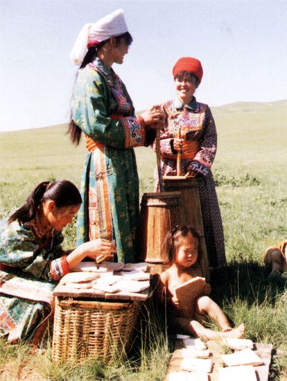 奶食分食品和饮料两大类,奶食有黄油(蒙古语称为协日陶斯)、白油、奶皮子(蒙古语称为乌如木)、奶豆腐(蒙古语称为胡乳达)、酸奶酪等。其中黄油、白油、奶皮子是奶食中的佳品,味道纯香,营养丰富。其中奶皮子作法是:将鲜奶放入器皿中存放一两日,奶子发酸后,在表面上形成一层薄皮,称为图黑乌如木,即生奶皮子,是做黄油的原料;另一种作法是,采用熬开的鲜奶发酸后形成的奶皮,称为宝勒森乌如木,即熟了的奶皮,是做酥油的原料。正蓝旗的奶食品制作精细,颇有名声,曾是清皇室制作奶食的地方。