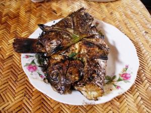 云南稻田养鱼,世代相传。每当稻谷成熟时,鱼已长肥,稻田开沟放水,在水口处置一竹笼,鱼顺水入笼,提回家烹制,配吃新米饭,乐趣无穷。地处滇西的傣族,因地制宜,稻田盛产挑手鱼。挑手鱼,又名胡子鱼,产于德宏州,喜在水田中生长,胸鳍两边各有一对硬刺,极其锋利,可将捕捉者的手挑破,故名。此鱼肉厚质细,营养丰富,用此鱼烹制的火烧鱼,软嫩鲜甜,香味扑鼻,能增食欲。 原料 主料:挑手鱼1000克。 调料:葱姜蒜末、青椒末、青姜叶末各对年0克,香菜末、荆芥末、花椒叶末各40克,薄荷、茴香叶末各20克,香茅草100克,草果粉4克,胡椒粉、味精各2克,食盐5克,酱油30克,绍酒20克。 制法 将鱼去鳃、去内脏,洗净,分成两份,一份取下鱼肉,捶成茸与上述调料拌成馅,将馅镶入另一份鱼的鱼腹内;鱼皮朝外,头尾折拢,用香茅草捆成十字形,再用芭蕉叶包好,埋入炭火中焐熟,取出,去芭蕉叶和香茅草,装盘即可。