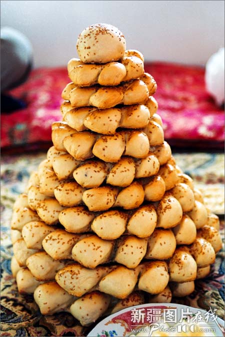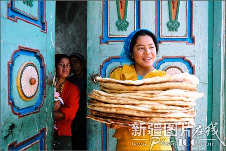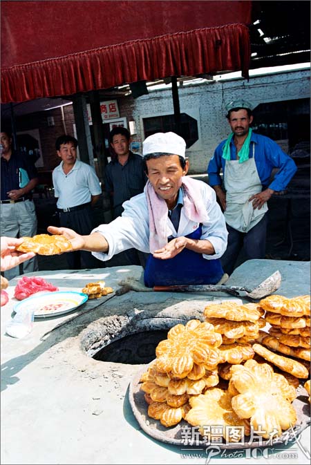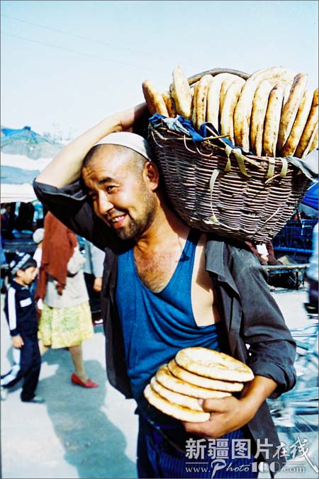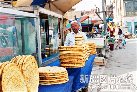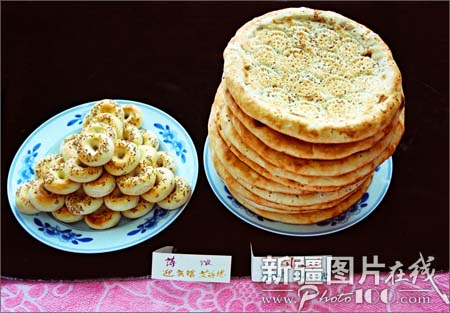 “馕”是维吾尔等民族日常生活的主食。以面粉发酵后在馕坑里烘烤而成,可以存放的时间很长,种类很多,大小不一。最大的馕直径有50厘米,周边厚,中间薄,戳有花纹,放少量盐和洋葱。最小的馕只有普通口杯大,最厚的馕有6厘米左右。此外还有肉馕、油馕、甜馕,又脆又香。