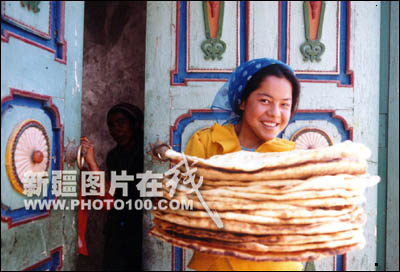 “馕”是维吾尔等民族日常生活的主食。以面粉发酵后在馕坑里烘烤而成,可以存放的时间很长,种类很多,大小不一。最大的馕直径有50厘米,周边厚,中间薄,戳有花纹,放少量盐和洋葱。最小的馕只有普通口杯大,最厚的馕有6厘米左右。此外还有肉馕、油馕、甜馕,又脆又香。