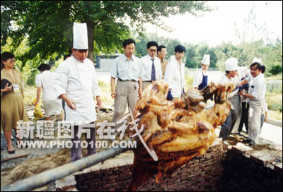 “烤全羊”是最具特色的美食,在招待贵宾的宴会上,是必上的大菜。“烤全羊”的制作考究,多选择两岁以内的羔羊,宰杀后,去其蹄及内脏,用精白面、盐水、鸡蛋、姜黄、胡椒粉和孜然粉调成糊状,均匀涂抹羊身,穿以木棍,放在特制的馕坑里,焖烤一小时左右即可。品尝时,只觉异香扑鼻,羊肉外酥内嫩,油而不腻。除了在宴会上,在维吾尔族聚居地区的“巴扎”(集市)也有烤全羊出售。