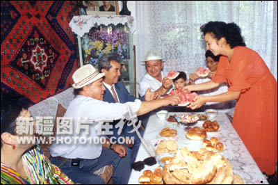 茶在新疆各族人民生活中的地位很重要,有“宁可三日无肉,不可一日无茶”之说,它不仅可以消化肉食,更可补充吃蔬菜少而缺少的维生素。牧民还喜欢饮用压制成砖块状的“茯茶”,色泽红褐,味道香醇,加上鲜奶、奶皮或酥油的“奶茶”,更是常见的饮品。