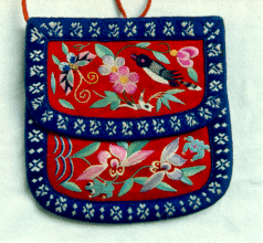 Hebao, the pinyin for Chinese embroidered pouch, is derived from the original name of an ancient food and turns out to be a bag for containing things. There are three shadows of meaning for embroidered pouch: 1. It refers to a bag woven out of satin and cloth. It has a thick inner layer, and is embroidered outside. It is widely spread among people and servers as a gift for expressing friendship and souvenir in social life. It can be used in daily life as mirror bag, fan bag, watch bag, card bag, tobacco bag and wallet, etc. Girls make it for practicing embroidery. There goes a custom in Suzhou of Jiangsu Province that girls begin to learn embroidery and make various pouches at the age of about seven. When married a girl gives the pouches she has made to the relatives and friends of her husband"s family on the occasion of wedding. They act as the gifts and a manifestation of her deftness in handiwork. Secondly, on the Dragon Boat Festival, Chinese people have the custom of inserting Chinese mugwort to exorcise the five poisonous creatures while girls make the embroidered pouches. In the pouch there are mugwort leaves and perfumed grass, so it is also called "perfumed pouch." It is attached to the front of clothing or hung around the child's neck. It can also be hung on the hooks of a bed net. Thirdly, it is a credit symbol for love. It is mainly given by the female part to the male part. 2. It refers to a kind of paper cutting. The paper is cut into pouch shape and can be used as the embroidery base or directly pasted onto the window paper. 3. It refers to a kind of folk song. Especially in the north, this kind of song is narrative and an expression of love. It varies little in music but is abundant in lyrics. In conclusion, the latter two shadows are the derivations of the first. Popularized by the folk song, the unique cultural meanings of the Chinese embroidered pouch is enhanced.