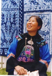 吴花花,女,苗族,真名叫吴景连,艺名花花。她的一副扎染作品,曾经在湖南卫视,以十万元人民币的价格拍卖。 现于湘西凤凰老城老街经营着一家扎染店,是老街上少数几家自产自销的扎染作坊之一。 吴花花的扎染花布上都在边角的地方染出"花花扎染"的印章般的纹样来,这是一种标志一种责任也成了一个品牌. 据说凭这个印章一块一米多宽,一米多长的花门帘能卖到一千五百块钱。