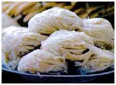 顾名思义,油塔子形状似塔,是维吾尔人喜爱的面油食品。一般做早点配合粉汤吃。塔子色白油亮,面薄似纸,层次很多,油多而不腻,香软而不沾,老少皆宜。