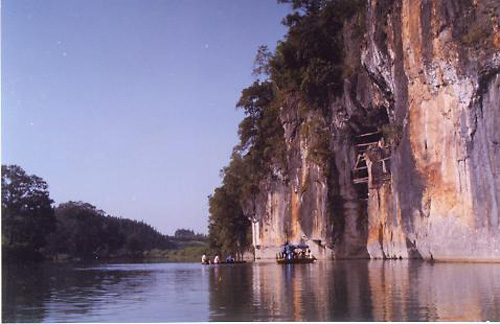 鸬鹚架景点在高屯镇东北1.5公里的下乌鸦寨河畔,河岸悬崖峭壁上有一石洞,洞口横亘木架,《黎平府志》载:似木非木,长可经丈,横跨于溪岩壁间,欹斜欲堕,数百年如故。洞前河内,鱼肥虾美,野鸬鹚觅食后,常栖于洞口木架上,因名“鸬鹚架”。