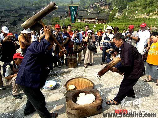苗族向来比较重视糍粑的制作和功用。逢年过节要打糍粑,祭祖要用糍粑,修建房屋要用糍粑。用糍粑招待贵宾胜过用鸡鸭猪狗招待。最有趣的是苗族青年男女从恋爱到结婚都离不开糍粑,每年腊月,苗族少女就要准备好各种形状的糍粑;三角形、园形、长条形、五色糍粑最多,色质以最白者为佳。待到正月初一至初三有外寨苗族未婚青年男子来游春,可以用事先准备好的糍粑向正在跳芦笙舞的意中人的花腰包投掷,如男子也有意,就接收,如无意,可婉言谢绝。待到正月结束,男子邀约好友以一斤糍粑一斤糖送至女方家,女子请好友作陪款待男子及其亲朋。如果话有投机,双方就可在以后的相月亮活动中交往,如无意,就不了了之。结婚第一年,男子要用一斗二升的糯米打成的大糯粑擀成簸箕状,装进麻布口袋中,挑至女方家,其意何故,不详。