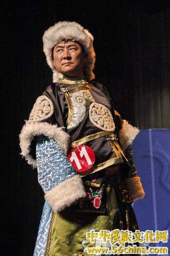 在呼和浩特举办的草原文化节上展示的科尔沁蒙古族男子冬季服饰(7月15日摄)。清代科尔沁蒙古族因居住地与满族毗邻,其装饰风格深受满族文化影响,头饰为珊瑚珠串头围带插各式簪钗,袍服制作亦吸收满族服饰风格,注重绣花、贴花、盘花等工艺的运用。新华社记者李欣