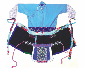 “吴东水乡服饰”因入选首批国家级非物质文化遗产名录而引起了记者的特别兴趣,这套江南妇女服饰从上到下依次有包头、眉勒、大襟拼接衫、作裙、穿腰束腰、大裆拼接裤、卷绑、百纳绣鞋8件,色彩以水蓝为主,其中大襟拼接衫,在衣服的前襟与袖口等易损部位设置了若干拼缝,随时可以把磨损的部位换掉,不致因打补丁而破坏整套衣服的美观,“美用一体化”的设计体现了江南水乡劳动人民的生活智慧。