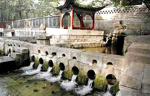 圣母殿始建于北宋天圣年间,是现在晋祠内最古老的建筑。圣母殿高19米,重檐歇山顶,面阔七间,进深六间,黄绿琉璃瓦剪边,雕花脊兽,四周围廊,殿前廊柱上木雕盘龙八条。殿的内部采用减柱法,扩大了空间,是中国规模较大的一座宋代建筑。殿内有宋代的彩塑43尊,主像圣母端坐木制的神龛里,其余42尊侍从分列龛外两侧,圣母凤冠蟒袍,神态端庄,侍从手中各有所奉,或侍饮食起居,或梳洗洒扫等,是宫廷生活的具体写照。塑像十分生动,充分地表现出人的神情,各个塑像神态自然,神情各异,塑工高超,是中国宋代彩塑中的精品。在圣母殿的南面,有一座北齐天保年间(公元550—559年)创建的难老泉亭,亭为八角攒尖顶。晋水主要的源头难老泉水从亭下石洞中汩汩流出,常年不息,因此北齐时撷取《诗经·鲁颂》中“永锡难老”的锦句为名,名为“难老泉”。泉水晶莹透明,常生萍四季一色,常年水温保持在17℃,历朝历代的诗人多吟诗赞美,唐代著名大诗人李白写下了“晋河流水如碧玉”,“微波龙鳞莎草绿”的佳句。源头上有明嘉靖四十二年(公元1563年)建造的水母楼,二层五开间,内塑水母坐像及侍女,体态优美,造型别致,也是宋代彩塑中难得的艺术佳品。