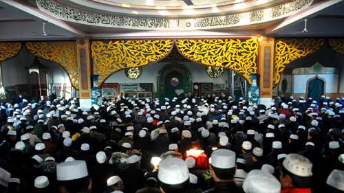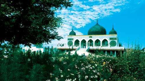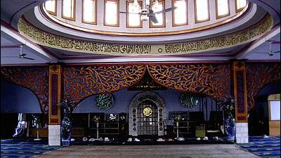 大殿顶部为一大穹顶,直径为9.5米,四角各为一小穹顶。大小穹顶通体全绿,顶部均有宝瓶装饰,其中大穹顶上的新月距面22米。大穹顶底部与殿内的方柱之间为圆柱形的鼓座,开设有24扇天窗,加上大殿内南北两侧各开6扇大窗,增加了殿内之光照亮度。此外,殿内还是19盏大宫灯,墙壁置双管玉兰灯。礼拜大殿下层为小礼拜殿、阿訇住房、会客室等,以回廊相连接。以后,该寺在大殿前又添建了两座方柱形的“邦克楼”和两侧长廊,使整个清真寺的风格浑然一体,典雅华美,庄重宏伟。殿前还有一喷水池,绿萍浮水,莲荷映月,院内绿树成阴,春夏秋三季百花争艳。