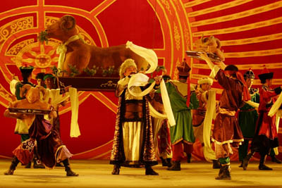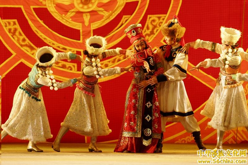 婚礼。蒙古族很注重婚礼仪式,尽管地区不同,形式各有差异,但都非常隆重、热闹。一般牧区的婚俗是:当娶亲回到男家后,新郎新娘不下车马,先绕蒙古包三圈。然后,新郎、新娘双双穿过两堆旺火,接受火神的洗尘。表示爱情的纯洁,新生活的兴旺。新郎新娘进入蒙古包后,首先拜佛祭灶,然后拜见父母和亲友。礼毕,由梳头额吉给新娘梳头。梳洗换装后,等待婚宴的开始。婚宴通常摆设羊背子或全羊席,各种奶食品、糖果应有尽有。婚宴上,新郎提银壶,新娘捧银碗,向长辈、亲友,逐一献哈达、敬喜酒。小伙子们高举银杯,开怀畅饮;姑娘们伴随着马头琴,放声歌唱。婚宴往往要延续两三天,亲友才陆续离去。而女方送亲者还要留人陪新娘住一至三日。有时,新娘的母亲也送亲,要住十多日。分别时,母女拥抱,痛哭,表示恋恋不舍。