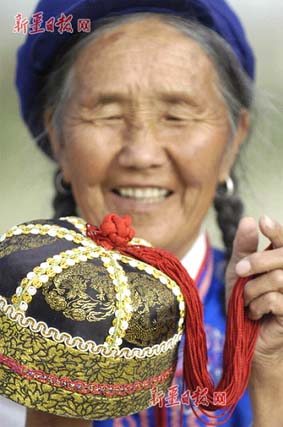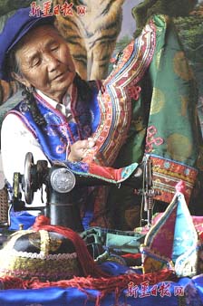 今年80高龄的努乃老人是一位民间的服装大师。说她是大师一点都不为过,老人从9岁开始学绣做民间服饰今年已71年了。在她的家中有各式各样的土尔扈特部落的传统服饰及布艺品,都是她老人家一针一线缝制的。仅帽子就有20多顶,12大类,有哈敦(官太太)帽、妇人帽、姑娘帽、新婚帽等。