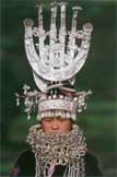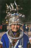 方你型 幼女戴瓢形花帽,五六岁即蓄发穿耳,十六岁以后挽髻,按逆时针方向换成螺纹状发髻,置于头顶中央,髻后根部横插一油黄色半月形木梳,代笄约发,保持发髻稳固。便装时,包一块用浅蓝色方格布制成长的方型头帕,打结于梳子下方,很少露头发,耳戴圆形牛鼻或梅花形大耳环。盛装时,头包一块较硬的藏青色长方形头帕,讲究起角,起直线,帕的两角交叉于梳子上方,用针别住,起燕尾形,称为“富代给”。着银饰时,不包头帕,头戴银冠,前插银钗、银角(呈牛角状),右插银簪,后插银梳,头髻插满各种形状的凤鸟,花果等银花及珠链;颈带两三只项圈(链泡泡项圈,犁索项圈,六方项圈,实心项圈,猴子链项圈,环锁丝链项圈)和项链,高齐下颚,甚至隐住嘴巴。胸前配戴腰子形锁式“压领”,浮雕龙凤等图案。上衣为大领半体衣(即胸前交叉式),袖短而大,卷袖,后摆略长于襟,袖、肩、领等部位有花饰,领略后倾,苗语称“沤坝”。老年妇女的便装,喜用平挑花,即以绿色丝线在蓝色或青色土布挑绣叶子或小花朵,形成纹样规则的连续图案,以作衣袖等花饰。老年妇女盛装,喜着数幅小粗花和数纱平挑有几何图案的新装。青年女子则穿大朵大花,大幅大样,构成密集的段子花纹,银纹和“领各介”,在最好的自织纹布上,用编线卷积成的花衣等。花饰色采以红绿色为主,喜红衣绿花,浅蓝衣菜花和亮铜片镶成的狗牙瓣,集编卷、缠绣、织花、平挑花、十字挑花、贴花等工艺于一身。银衣以数十件四方形、长方形、圆形的银肩片、银背角片、银泡、小银铃等在衣服相应部位纵横交错镶缀而成。银饰图案有人物、花草、飞禽走兽和几何图形,腰束银花腰带。裙子为桶形百褶裙比各地均长,盖及脚腕,无花饰。盛装时,有的穿百褶裙,外还套上片式绣花的带子裙,即“古罗裙”,苗语称“库达”。裙正方围有围裙帕,宽约48公分,帕面饰有各种方块花鸟图案,多用几何纹样的织花或线条粗壮的绣花,老年人则用无花饰的素帕。手饰空心镂花手钏,实心雕花手钏和犁索手钏等,一般戴两副以上。腿饰,老年妇女冬季均饰青土布裹腿,夏季饰家织青布或购买阴丹士林布缝制成的夹袜,袜后跟绣一长方形花草图案,袜尖及袜帮挑绣鸟类图纹。年轻女子无论冬夏,大多赤腿或穿商店买来的袜子。鞋有布鞋、胶鞋和草鞋,布鞋以青布或缎子作面,鞋帮绣花,鞋尖勾鼻,布壳纳底,无跟。草鞋为糯稻芯编织的平头无后跟的勾鼻无跟拖鞋。