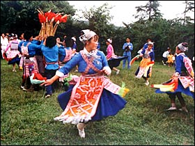贵州省花溪的苗族青年男女,每当年节喜庆时就会自动聚到一起,边吹芦笙、边跳“芦笙舞”。在演奏芦笙的人群中,除青年男子之外还不乏妙龄少女。她们与男芦笙手同站一个舞圈,毫不逊色地边吹奏着手中的芦笙边与外圈的女子共舞。两个舞圈相互交叉、换位,一会儿向中心蹦跳聚拢、一会儿又向外围旋舞散开,有如百花园中的朵朵鲜花在争妍绽放,又好似缤纷的彩蝶在纵情歌舞。虽然这些舞者都并非出自专业的舞人,但舞蹈风格的古朴、潇洒和舞者发自内心的喜悦,领一旁的观看者,也会被这充满生机的歌舞所感染,乐不可支地随歌舞而拍手顿足。