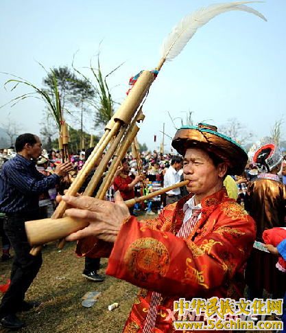 2月10日,一名苗族群众在坡会上吹奏芦笙。