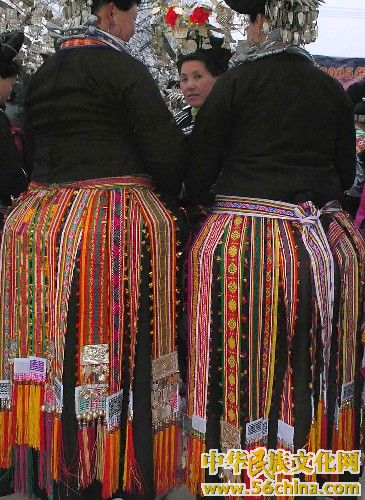 苗族妇女在展示仿照锦鸡尾羽做成的裙子。