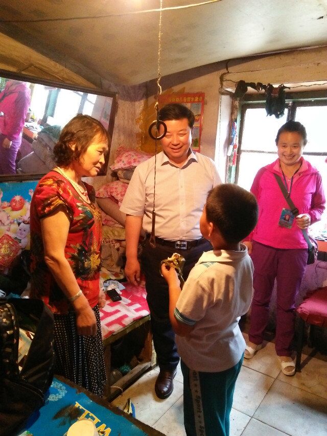 低保户刘英60岁,老伴2015年患病去世。刘英本人身体患有多种疾病,靠低保维持家庭生活。刘英还帮助单身女儿陶红丽抚养两个8岁的双胞胎外孙,家庭生活很是拮据。住建局曲局长见到此情形从衣服口袋中掏出200元人民币现金给了刘英,接着又掏出200元人民币现金给了双胞胎兄弟,那吉镇政府张镇长和繁荣社区书记李霞把自己亲手包的粽子和做好的手工葫芦递给刘英。刘英接过慰问金和端午节小礼物非常感动,感激地说“今年的端午节非常幸福,有各位领导的关心一定会在今后的生活中更加坚强”。两个双胞胎兄弟也表示非常感谢,一定要好好学习,将来做一个对社会有用的人。曲局长又查看了刘英家的住房,表示要解决刘英家的住房维修,一定要让老百姓住房有安全感。