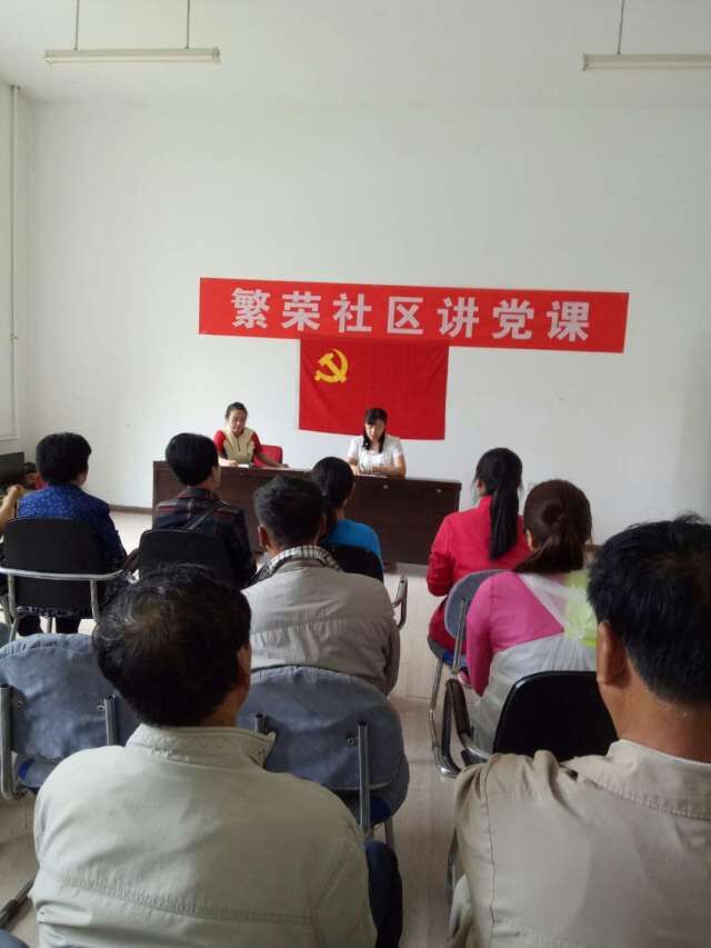 2016年6月30日,繁荣开展了“繁荣社区讲”活动。社区组织党员26名,由那吉镇纪检书记赵洪伟同志授课,专题教育以“学党章党规、学系列讲话、做合格党员”为主题,各支部全体党员参加了培训。