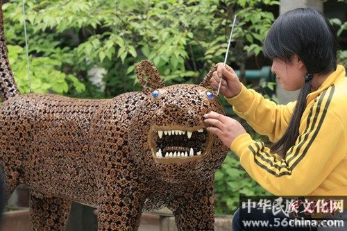 甘肃省陇南市徽县民间工匠以当地所产的野生山核桃为原料,利用其独特的纹理和自然镂空的效果以及坚硬的质地,经过洗选、切片、剔果仁、干燥、粘接、定型、抛光、细雕等二十多道工序,制作成虎、象、马等形状的工艺品,以及各式瓶、筒。由于整个加工过程系纯手工操作,产品完整保留了核桃的原始外形和自然花纹。殷春永摄 甘肃省陇南市徽县民间工匠以当地所产的野生山核桃为原料,利用其独特的纹理和自然镂空的效果以及坚硬的质地,经过洗选、切片、剔果仁、干燥、粘接、定型、抛光、细雕等二十多道工序,制作成虎、象、马等形状的工艺品,以及各式瓶、筒。由于整个加工过程系纯手工操作,产品完整保留了核桃的原始外形和自然花纹。殷春永摄