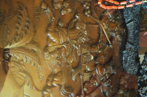 把木头运回加工处,老赵和根雕师傅点起烟,围坐在大树根旁,边喝茶边思量,琢磨来琢磨去,怎么看也只是个普通的根雕茶桌。有点不甘心的老赵突然灵机一动:“如果我把它立起来呢?它可是一块屏风的好料子啊!”几个老师傅顺着这个思路联想树根的造型,如何将屏风的神韵展现出来。历时半年,4吨多的树根被加工为约1吨的根雕作品,老赵和师傅们都相当满意。