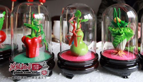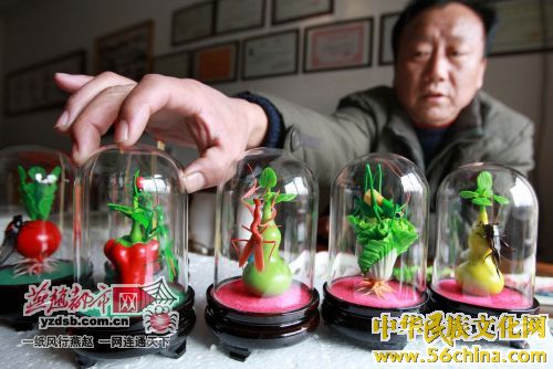 没亲眼见过王亮捏的蝈蝈,谁也不会想到在深泽一个小村庄内竟隐藏着一位世界级的民间艺术大师。在王亮家中的工作室,记者透过壁柜的玻璃窗看到了摆在里面的各色面塑作品:白菜螳螂、萝卜蟋蟀、白菜蝈蝈、恭喜发财等等。须眉生动、惟妙惟肖,令人叹为观止。