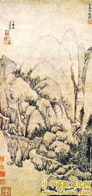 有文介绍这幅画特点之一,是用“生宣纸”画的,似以之区别于《富春山居图》。这样的提法有些模糊。其实,我们现在所称的“熟宣纸”,是指以化水的“生宣纸”为原料,浸透了动物胶、明矾、云母等配成溶液,晾干后制成的不化水的纸。而元代画家用的纸,应该还不是这种经过再加工的纸,而是当时一种特别的用麻等粗、长纤维植物为原料制成的纸,质地非常紧密、厚实,能稍吸水,但不晕化,故适于元代绘画“干笔皴擦”的需求。明代以后,因为已大量采用以安徽泾县的檀树皮、稻草为原料制生宣纸,质地较松,较化水,要画宋元风格的画,就不得不改用再经胶、矾加工制成的“熟宣纸”了。 (张德宁)