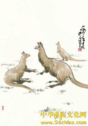 吴作人(1908-1997),幼年深受传统文化熏陶,1928-1930年进南国艺术学院(院长田汉),确立了自己的人生观和艺术观。之后,他游学欧洲,接受西方绘画的严格训练,回国后则远涉大西北,领略古代艺术瑰宝的魅力。由此,他一方面成了开创中国油画学派的代表人物之一,一方面把大量精力投入国画创作。晚年的他,更突破了传统国画模式,运用“举要治繁”手法,对自然形象作高度概括,往往是随手拈来,用笔不多而惟妙惟肖,意趣横生,从而开拓出水墨写意画的新境界。至于比较写实的作品如《袋鼠图》又是另一类风格了。