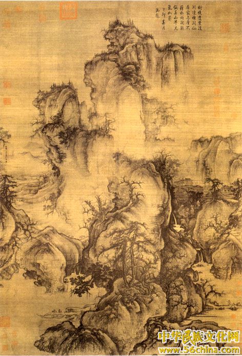 这幅画的构图就是“三远法”理论的充分证明:从水边山石到远方山峰自上而下的“高远”;从前山望后山,茫茫无限的“深远”;从近山望远山,恬淡缥缈的“平远”。他将“三远”法结合使用,巧妙地展示了峰峦秀挺,烟霭浮腾,林木舒发,溪流淙淙的景象;渔夫樵子,旅客游人,置身其中,个个意态欣然。